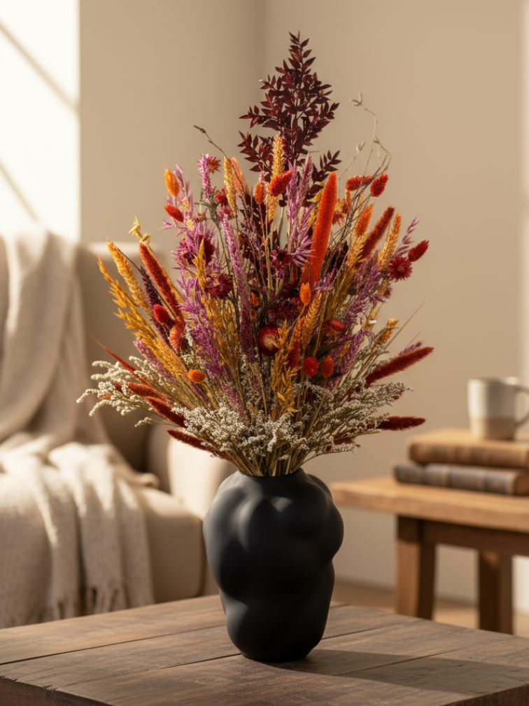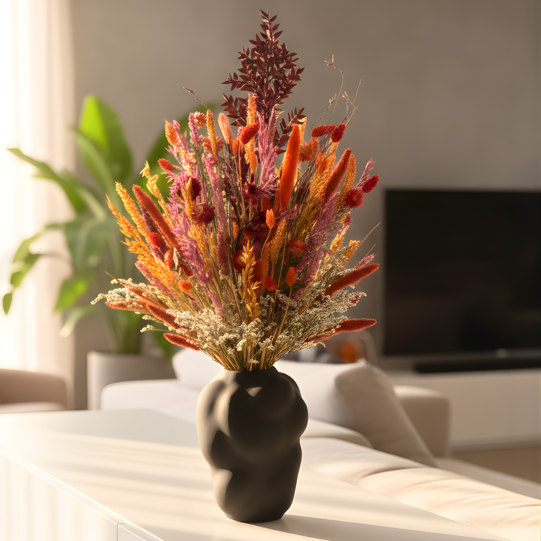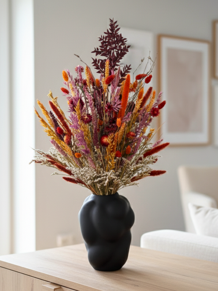 Dit prachtige droogbloemenboeket is het ideale boeket voor deze herfst. Dit Trendy boeket "Boeket "Warm Sunset" (Large) bestaat uit prachtige donkere en warme tinten, die men doet denken aan een mooie zonsondergang! Dit droogboeket is prachtig vol en geplaatst in een organisch gevormde matzwarte vaas.