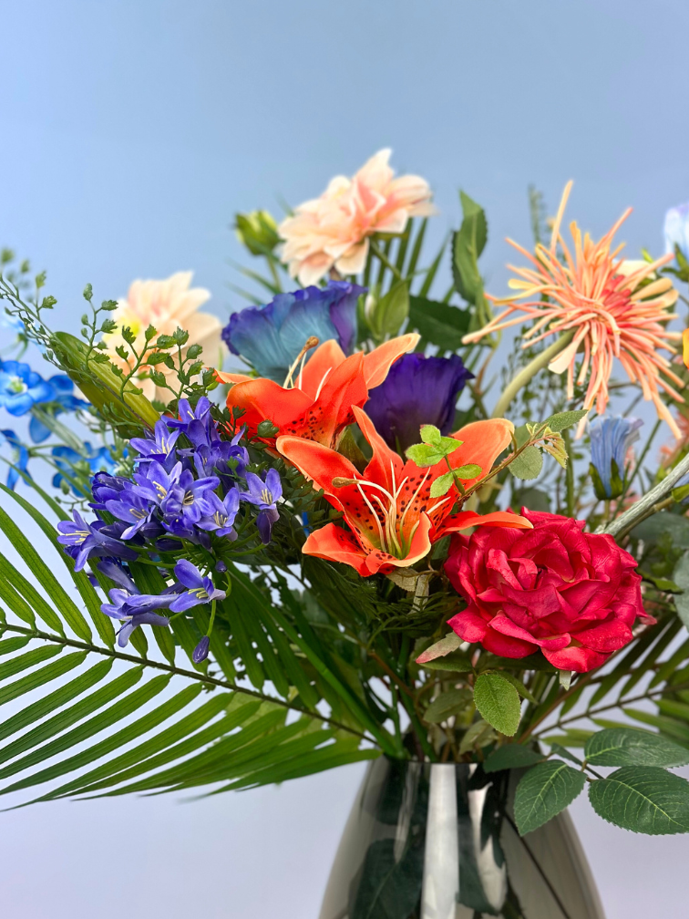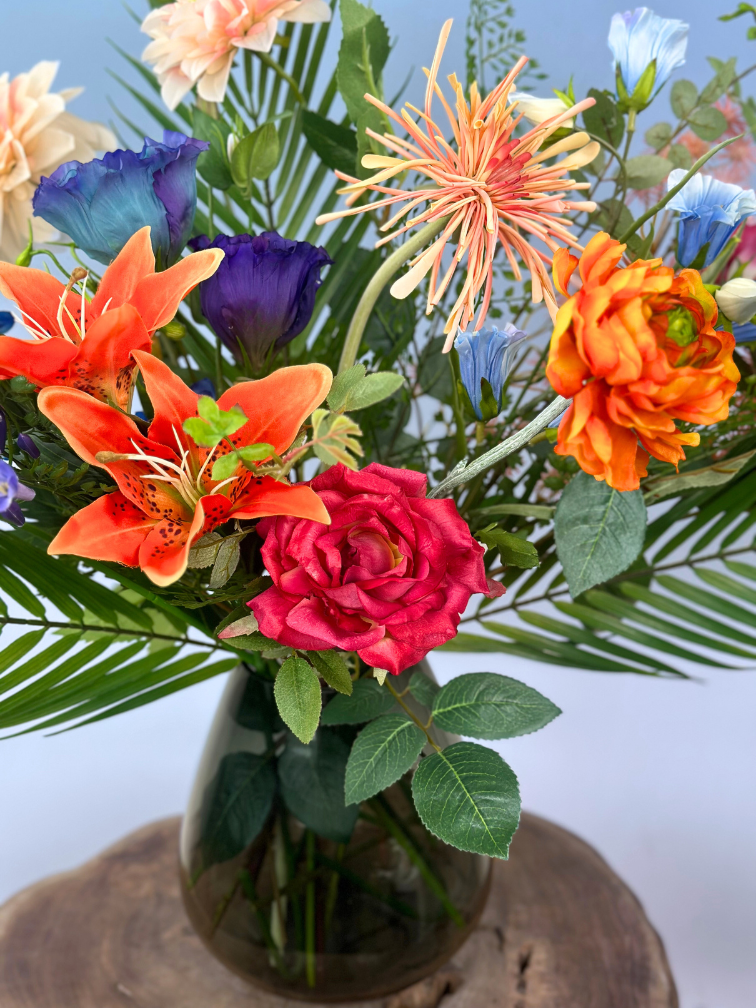 Ons prachtige zijden bloemen boeket "Luminous Colors" bestaat uit fel gekleurde kunstbloemen (polyethyleen). Zijden bloemen boeket "Luminous Colors" neemt een stijlvolle, vibrant en oogverblindende sfeer met haar mee. Zo kun je dit prachtige boeket bijvoorbeeld in jouw eetkamer neerzetten zodat je iedere keer tijdens je eetmomenten weer kunt genieten van de prachtige kleuren en gezellige sferen van dit boeket, zodat het keer op keer weer aanvoelt als een unieke sfeerbeleving. Daarnaast is dit een boeket dat er het hele jaar voor zorgt dat jij een heerlijk zomers gevoel in huis haalt. Het ziet er ontzettend chique uit in de vaas van de foto.