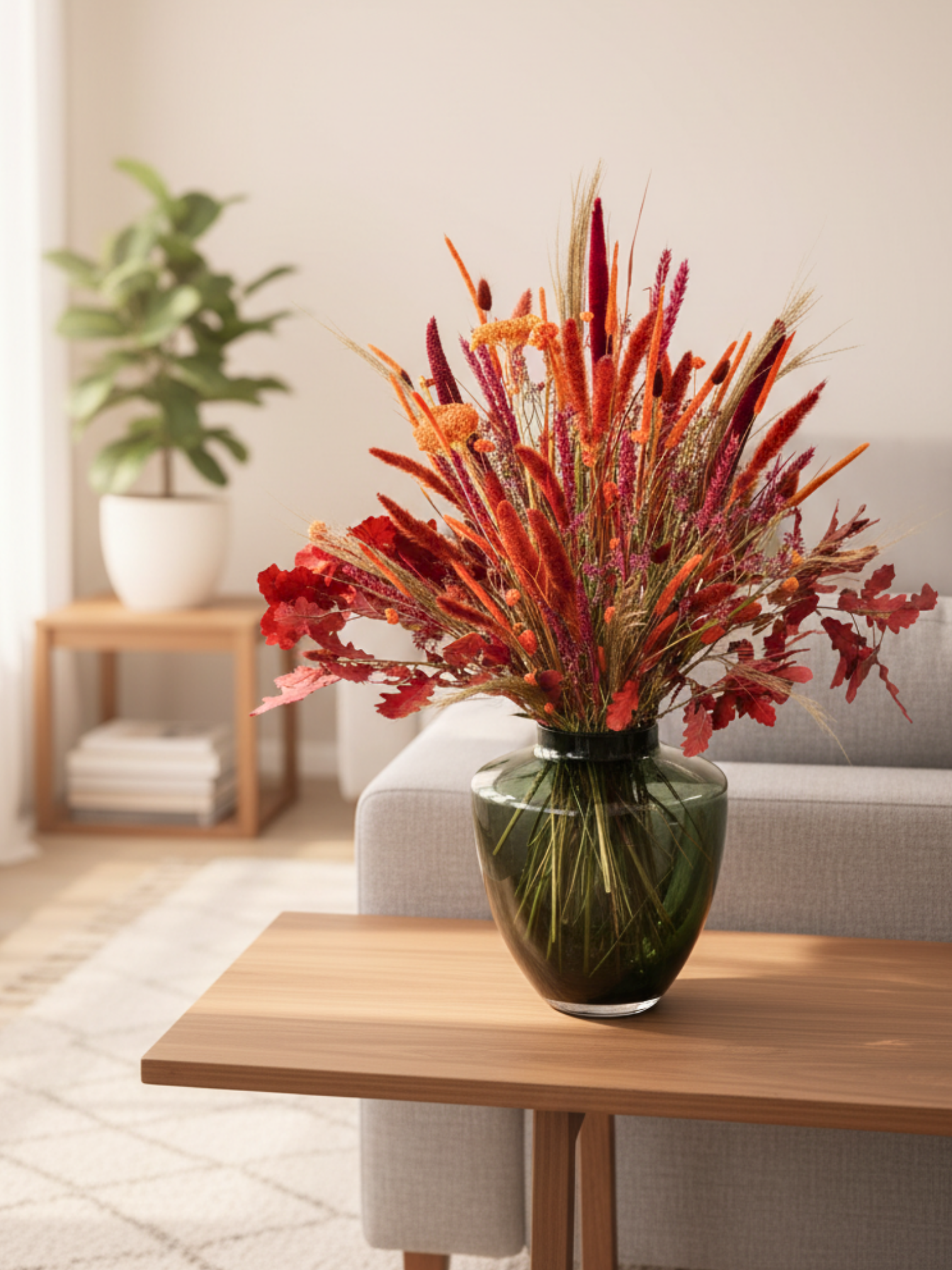 Dit betoverende droogbloemen boeket brengt die magische herfstsfeer rechtstreeksnaar jouw woonkamer. De rijke bordeauxrode, warme oranje en zachte bruine tinten vormen samen een harmonieus geheel dat doet denken aan vallende bladeren en gouden zonnestralen door de bomen. Als finishing touch zijn de takken versierd met prachtige gedroogde eikenbladeren, een subtiel detail dat het boeket zijn natuurlijke charme geeft.
