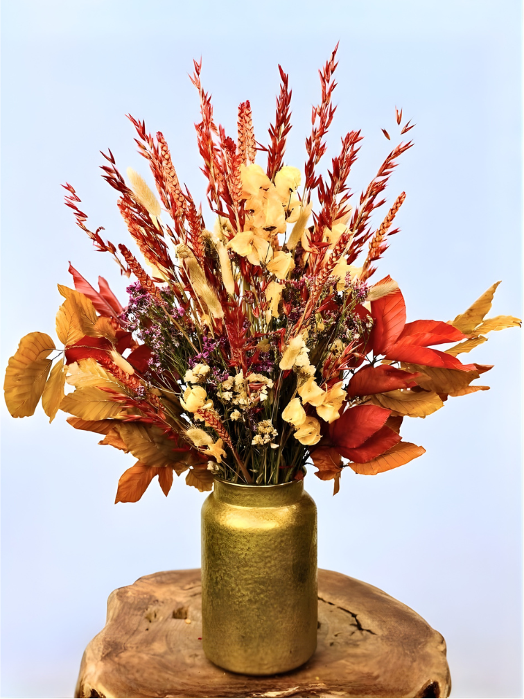 Laat je interieur stralen met ons droogbloemen boeket 'Golden Kiss'. Een warm en elegant droogboeket vol goudgele en vurige roodtinten.
