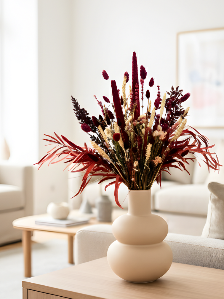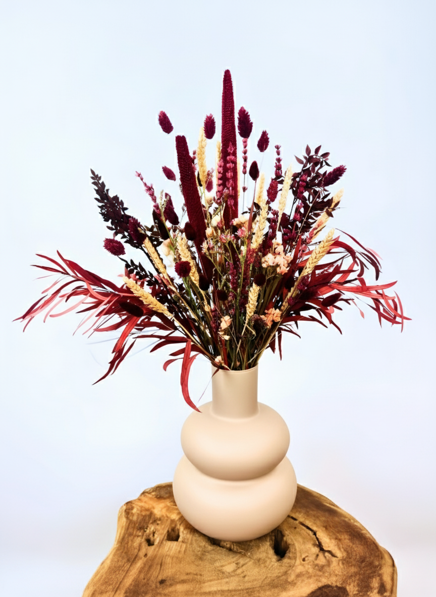 Maak jouw interieur helemaal af met ons vurige droogbloemen boeket 'Madam Rouge'. In dit droogbloemenboeket zijn prachtige bordeaux rode bloemen gecombineerd met zachte pastel accenten. Het droogbloemen boeket 'Madame Grise' is verwerkt in de zéér stijlvolle grijze vaas (Donnie), vandaar de naam 'Madame Grise". Het boeket is met deze stijlvolle vaas te bestellen.