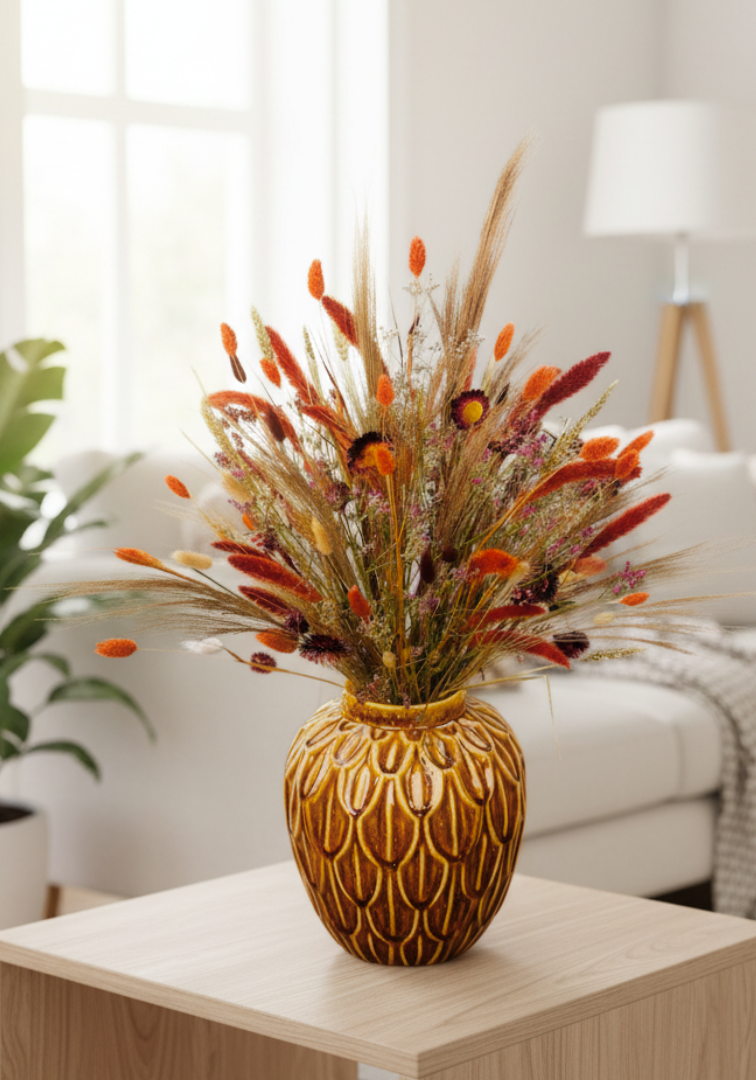 Droogboeket 'Modest Fall' is een échte parel die zeker niet mag missen in jouw huis! Met haar prachtige warme herfsttinten haalt ze een heerlijke warme sfeer in huis.