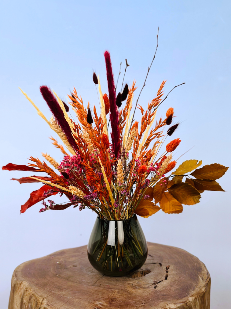 Ons droogbloemenboeket "Josephine's Colours small" brengt de warmte en gezelligheid van de herfst in huis. Met prachtige tinten van bordeaux, rood, bruin en oranje, straalt dit boeket een subtiele elegantie uit. Ideaal voor een sfeervolle touch in elk interieur, het vangt de essentie van het seizoen in een tijdloos arrangement.