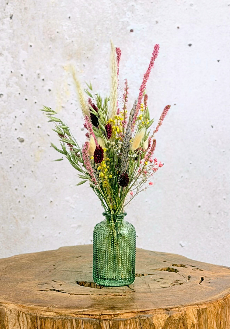Op zoek naar een klein, maar mooi en vol droogbloemen boeketje met vaasje? Dan is onze "Lady Dana mini" perfect voor jou. Je kunt kiezen voor het setje met een groen vaasje of het setje met een transparant vaasje (zie opties).