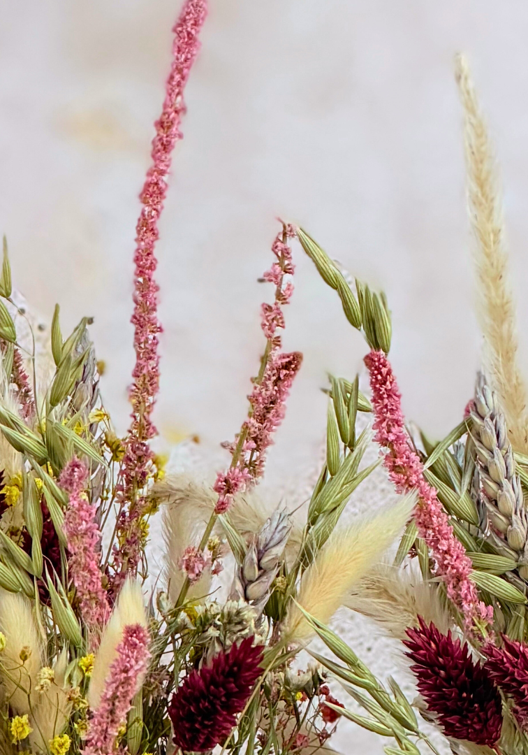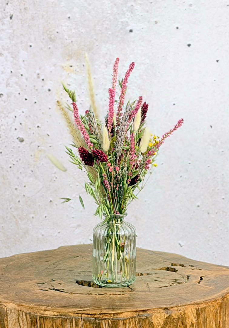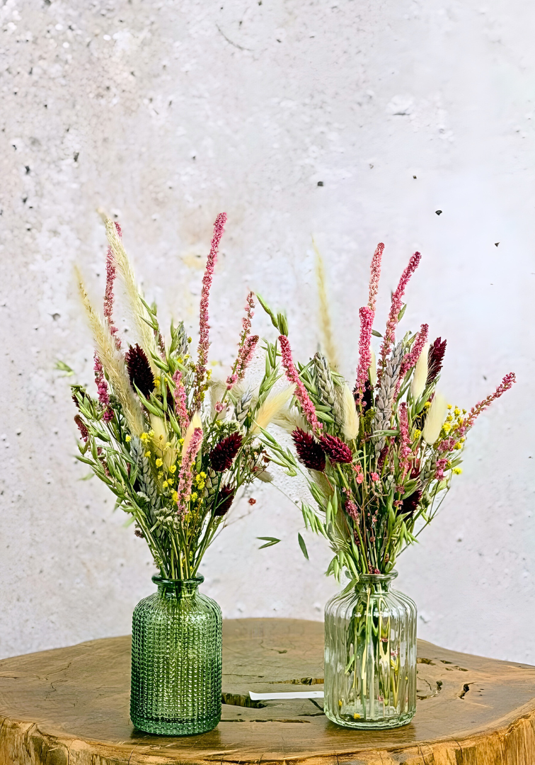 Afmetingen vaasjes & droogbloemen: diameter 15 cm & hoogte 20-25 cm.