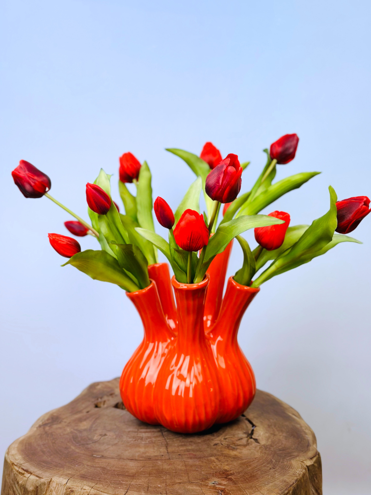 Dit prachtige kunst boeket wat bestaat uit tulpen is een verfrissend en vrolijk product om in jouw interieur te plaatsen. De kleuren die terugkomen zijn rood gekleurde tulpen. De oranje tulpenvaas maakt het helemaal af.