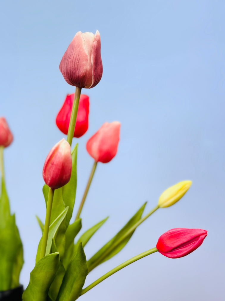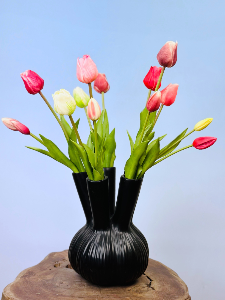 Dit prachtige kunst boeket wat bestaat uit tulpen is een verfrissend en vrolijk product om in jouw interieur te plaatsen. De kleuren die terugkomen zijn roze, zalmkleurige en witte tulpen. De zwarte tulpenvaas maakt het helemaal af.