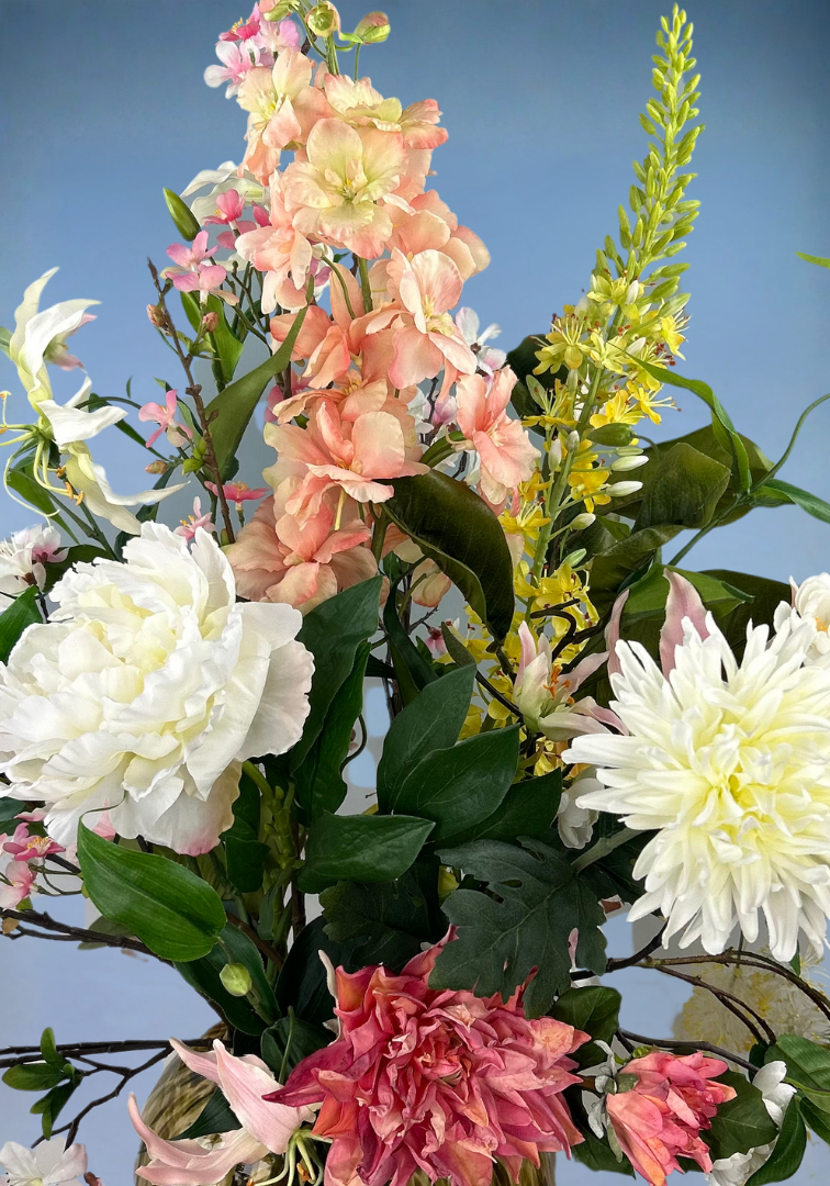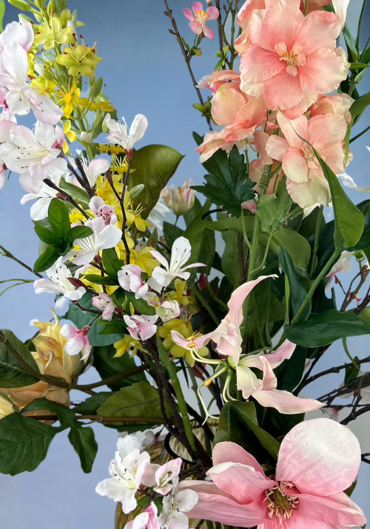 Breng een dromerige, bohemien sfeer in huis met het zijden boeket Bohemian Dream. Dit 80 cm hoge arrangement combineert zachte pastelkleuren, van lieflijk roze en zuiver wit tot zonnig geel – die samen een harmonieus en vrolijk geheel vormen. Elke bloem is zorgvuldig vervaardigd van hoogwaardig zijde, waardoor het boeket een levensechte uitstraling heeft zonder dat je je zorgen hoeft te maken over verwelken of water geven.