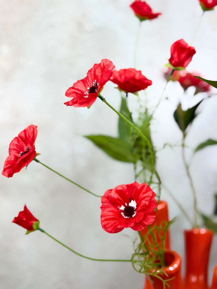 "Flaming Love" is een opvallend zijden boeket vol vurige rode tinten, speelse vormen en frisse groene accenten. Gecombineerd met de glanzende oranje vaas is dit een echte sfeermaker. Altijd mooi, geen onderhoud en inclusief vaas