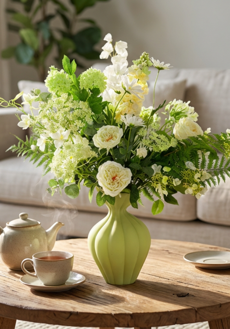 Het boeket is gestyled in een organisch groene vaas, maar kan ook prachtig worden gecombineerd met andere organische vazen uit onze webshop. Ideaal voor de woonkamer, hal, slaapkamer of kantoor. Volledig onderhoudsvrij en blijvend mooi, het hele jaar door.