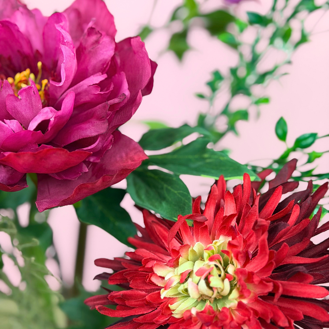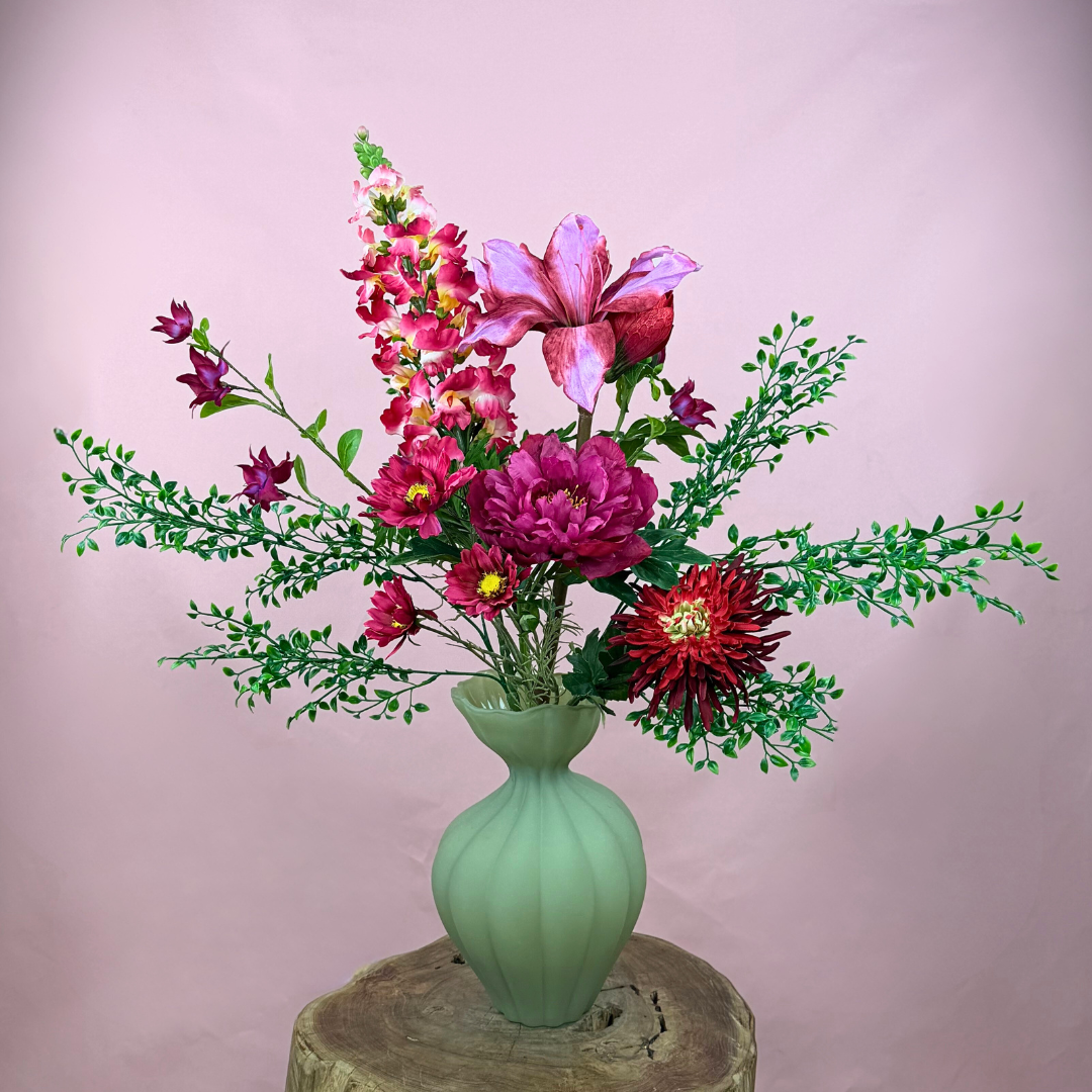 Betreed een wereld vol romantiek en vurige elegantie met ons zijden boeket 'Garden of Passion'. Dit prachtige zijden bloemen arrangement van 80 cm is gestyled in onze populaire matgroene vaas met een organische, zachte vorm, die de perfecte omlijsting vormt voor de weelderige diep rood- en roze zijden bloemen. De grote, luxueuze bloemkoppen lijken elk moment te kunnen openen en stralen een intense passie uit die elke ruimte vult met warmte en verfijning.