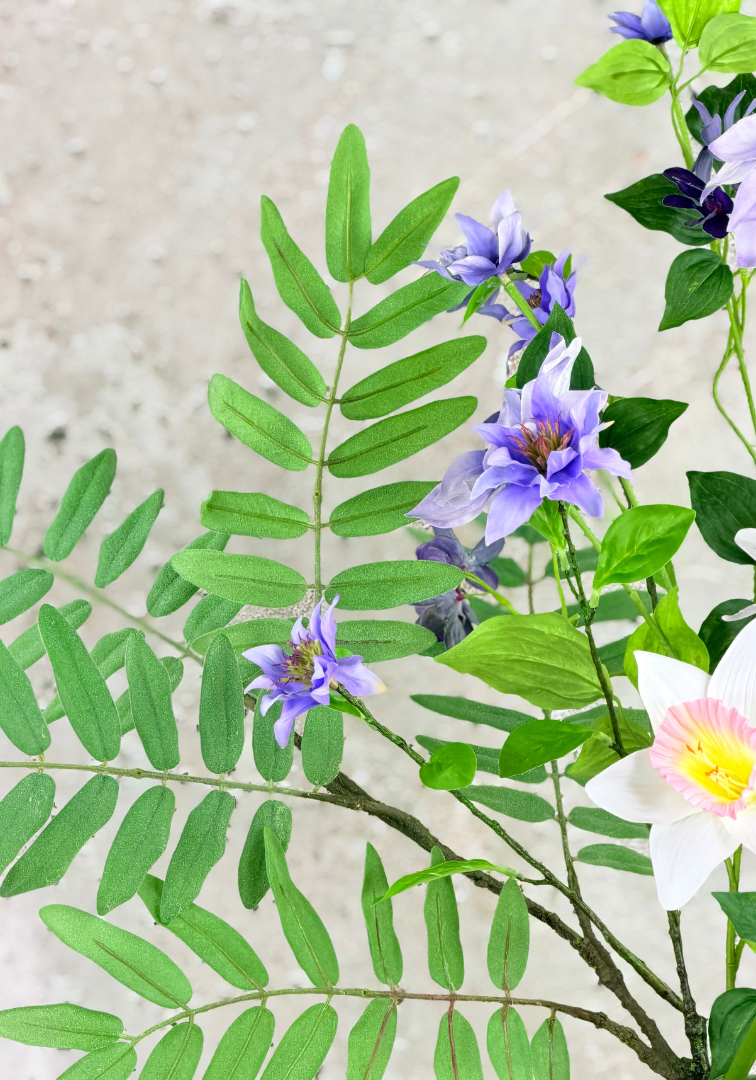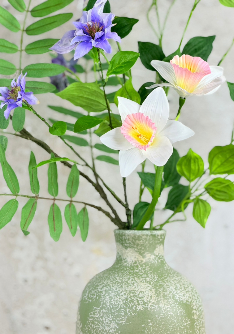 Stap binnen in een wereld van tijdloze elegantie met ons prachtige zijden boeket 'Lilac Dreams'. Een bloemstuk dat de magie van de Engelse pluktuinen naar jouw woonkamer brengt. Elke bloem is zorgvuldig geselecteerd. Dit boeket bevat ook 'real touch' zijden bloemen. En zoals de naam al verraad lijken deze zijden bloemen net vers! Hierdoor krijg je het gevoel dat je een verse pluk uit een idyllische tuin in handen houdt. De zachte tinten van lila bloesem worden prachtig aangevuld met lieflijke narcissen, waardoor het geheel een romantische en dromerige uitstraling krijgt die zowel vrolijk als verfijnd oogt.