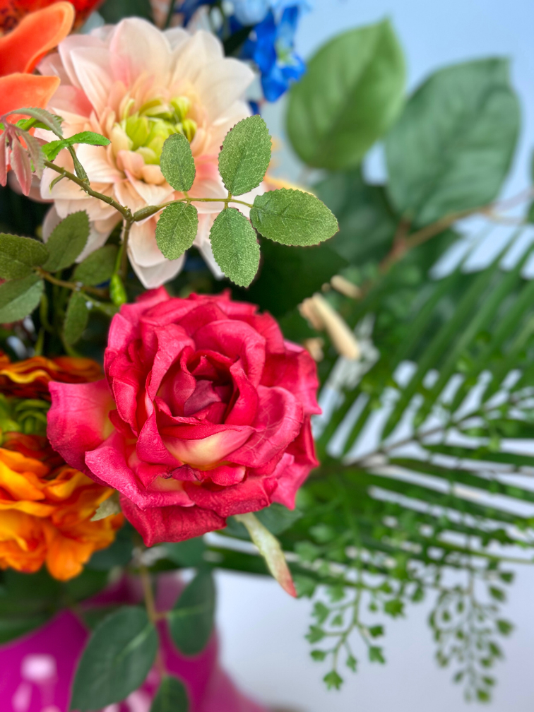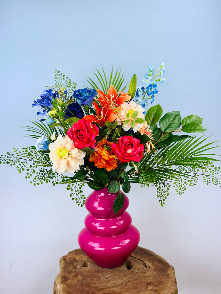 Ons prachtige zijden bloemen boeket "Luminous Colors" bestaat uit fel gekleurde kunstbloemen (polyethyleen). Zijden bloemen boeket "Luminous Colors" neemt een stijlvolle, vibrant en oogverblindende sfeer met haar mee. Zo kun je dit prachtige boeket bijvoorbeeld in jouw eetkamer neerzetten zodat je iedere keer tijdens je eetmomenten weer kunt genieten van de prachtige kleuren en gezellige sferen van dit boeket, zodat het keer op keer weer aanvoelt als een unieke sfeerbeleving. Daarnaast is dit een boeket dat er het hele jaar voor zorgt dat jij een heerlijk zomers gevoel in huis haalt. Het ziet er ontzettend chique uit in de vaas van de foto.