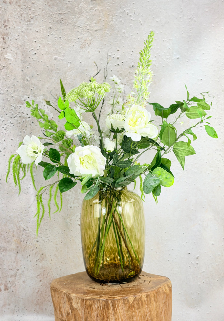 Het boeket is hier gestyled in de Arctic Cheetah vaas van het merk Vase The World. De combinatie van het frisse groen met de warme, luxe uitstraling van de vaas zorgt voor een tijdloos en stijlvol geheel. Dankzij de uitgebalanceerde vorm en hoogte is dit zijden boeket perfect geschikt voor alle Arctic vazen uit ons assortiment.