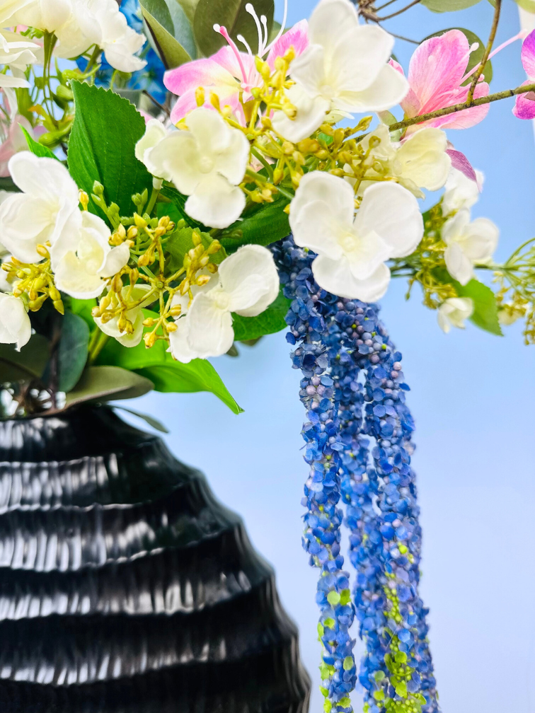 De bloemen zijn prachtig gestyled in de populaire zwarte ovale vaas, die het geheel een moderne, chique uitstraling geeft. De strakke vorm van de vaas vormt het perfecte contrast met de zachte, luchtige bloemen, waardoor het boeket zich thuis voelt in zowel een minimalistisch als een klassiek interieur.