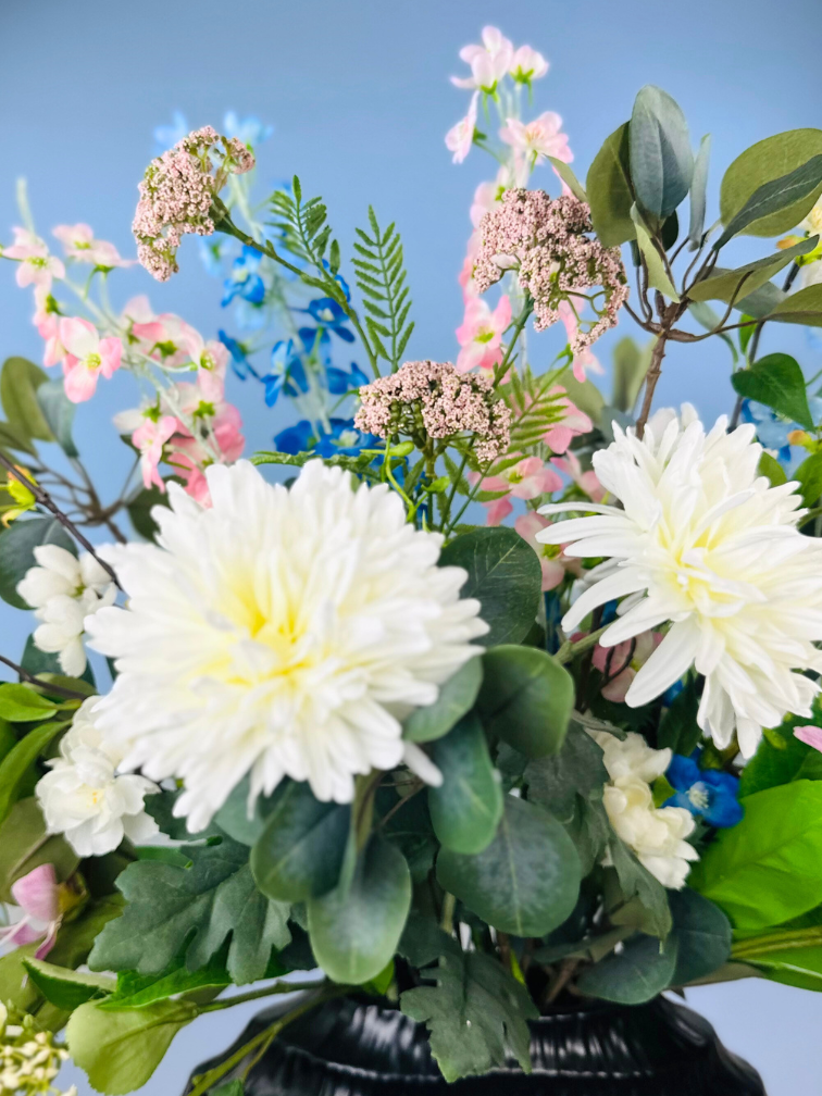 Ontmoet ons zijden boeket Serene Grace, het zijdenboeket dat zijn naam eer aandoet. Dit royale arrangement is gevuld met een harmonieuze mix van witte, roze en blauwe bloemen, zorgvuldig op elkaar afgestemd om een rustgevende en elegante uitstraling te creëren.