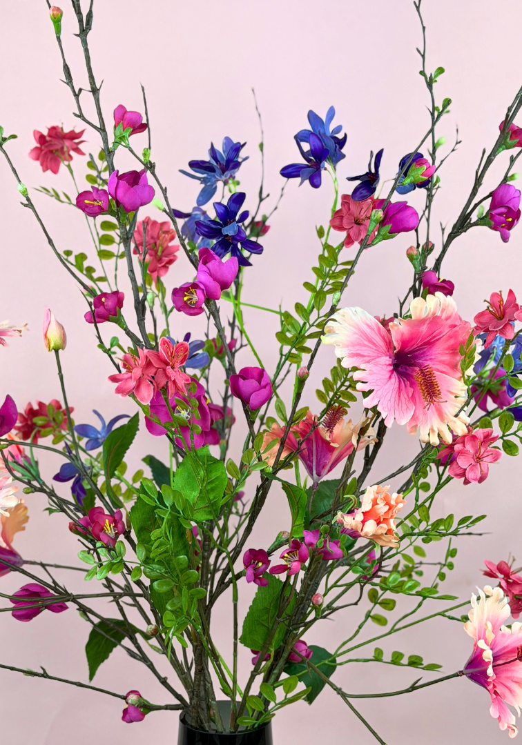 Met haar fuchsiaroze bloesemtakken, rijke bloemkoppen en real touch bloemen in rood, fuchsia en paars brengt zijden boeket 'Sweet Blossom Storm' een warme, gezellige sfeer in elke ruimte.