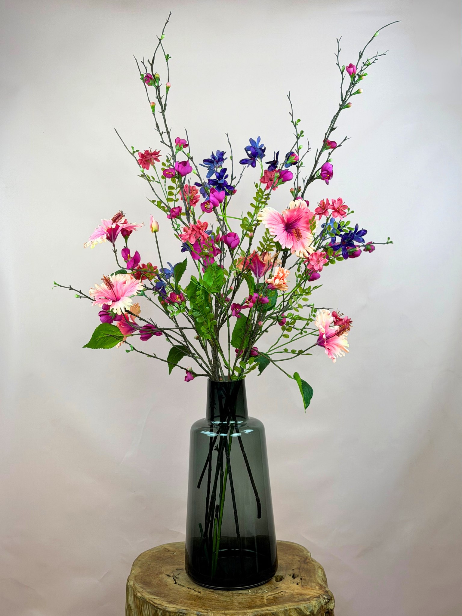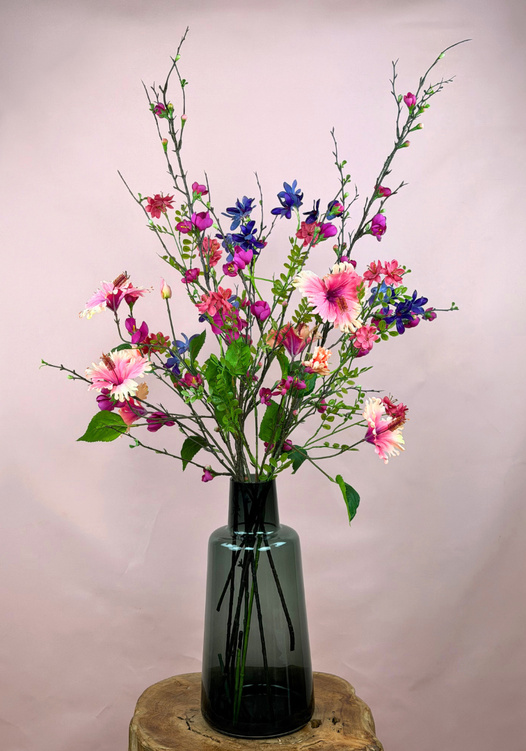 Tussen deze hoge, statige bloemen vind je real touch viooltjes die met hun levensechte blaadjes een teder en romantisch accent toevoegen. Ze ogen alsof je ze zo uit een ochtendfrisse tuin hebt geplukt, maar dan zonder dat ze ooit hun glans verliezen. De toevoeging van zijden eucalyptus maakt het geheel compleet: de sierlijke groene takjes zorgen voor luchtigheid, balans en dat natuurlijke tintje dat het boeket nog harmonieuzer maakt.